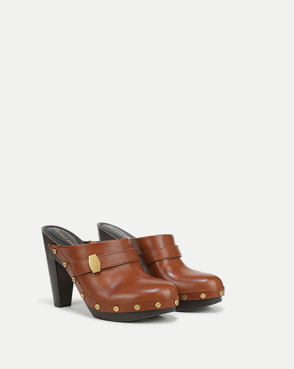 An elevated take on the classic clog—literally. Giana is a heeled mule-style clog, crafted from premium tan leather. Designed for serious height, it features a four-inch cone-shaped block heel and one-inch platform, finished with our signature Dash belted hardware and gold studs along the base. Pair these statement platform heels with everything from your favorite VB flares to boho-style maxi dresses.