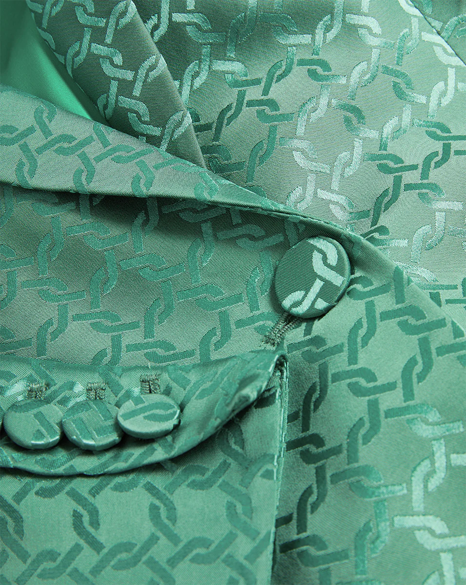 Issel is an elevated take on the classic blazer. Crafted from a luxe silk-viscose blend in vibrant green with a tonal chain print, it features a relaxed, elongated silhouette and a wrap-style tie to cinch and define the waist. A peak lapel, chest welt pocket, and self-covered buttons at the front and sleeves add to its clean and streamlined appeal. For a polished yet effortless spring set, pair with the coordinating Colter pants, or style with your favorite VB denim to elevate the everyday.