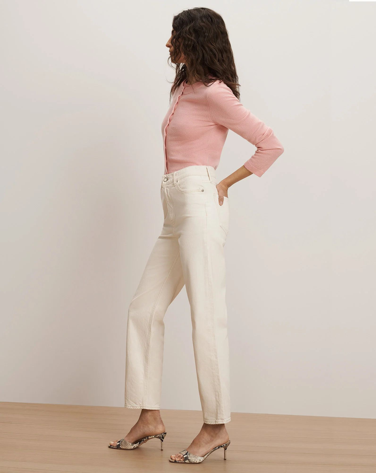 The straight-leg jean, perfected. Expertly crafted in LA from Italian stretch denim in ecru, the Leah fits snug through the hip and thigh before falling into a classic straight leg. It’s finished with an easy mid-rise waist and ankle-length hem—perfect for showing off your shoes. Style with a simple T-shirt and dickey jacket for a classic VB look.
